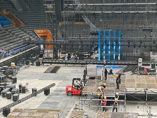 在國(guó)家體育館,一場(chǎng)文藝演出的舞臺(tái)正在搭建。