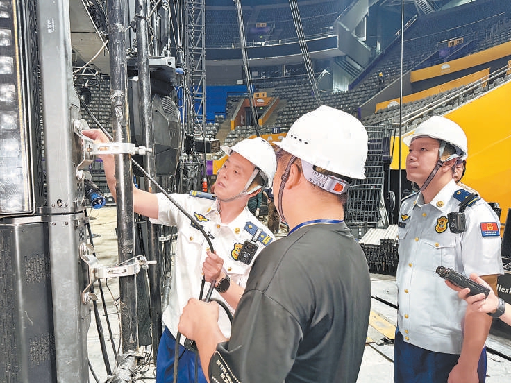 昨天下午,在國(guó)家體育館,一場(chǎng)文藝演出的舞臺(tái)已現(xiàn)雛形。此次活動(dòng)的主承辦方和搭建方都是江蘇企業(yè),第一次來(lái)京舉辦文藝演出,對(duì)一些消防要求擔(dān)心把握不準(zhǔn)確,因此連同場(chǎng)館方,向朝陽(yáng)區(qū)消防救援支隊(duì)“求助”。該支隊(duì)重點(diǎn)保衛(wèi)處處長(zhǎng)隋興亮和同事到場(chǎng)指導(dǎo)。